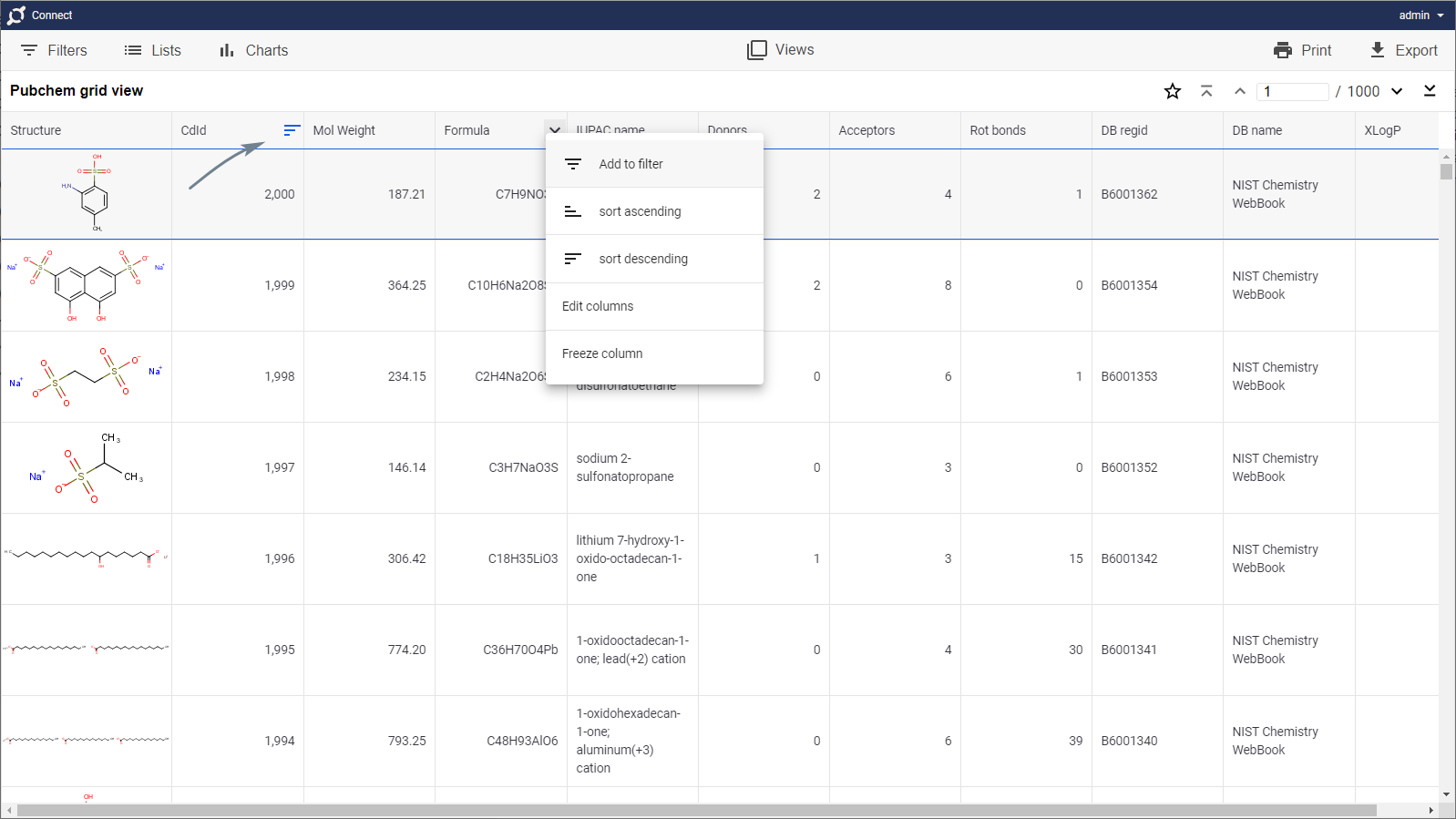 In the screenshot below you can see three fields on which the Multi field sorting was applied in following order: Mol Weigh first, donors second and acceptors third (last). The field with the highest sorting priority is marked either with