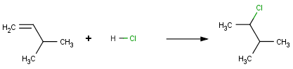 Reactions with addition mechnism are often guided by the Markovnikov's rule. This rule states that upon the addition of hydrogen halides to an alkene, the hydrogen becomes attached to the carbon having more hydrogen atoms (alternatively, having fewer alkyl substituents).