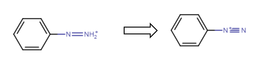 | Transform Diazonium (action string: '[#6]-[#7:1]=[#7H2+:2]>>[#6][N+:1]#[N:2]') |