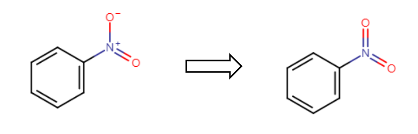 | Transform Nitro (action string: '[O:3]=[N:1]=[O:2]>>[#8-:2]-[#7+:1]=[O:3]') |