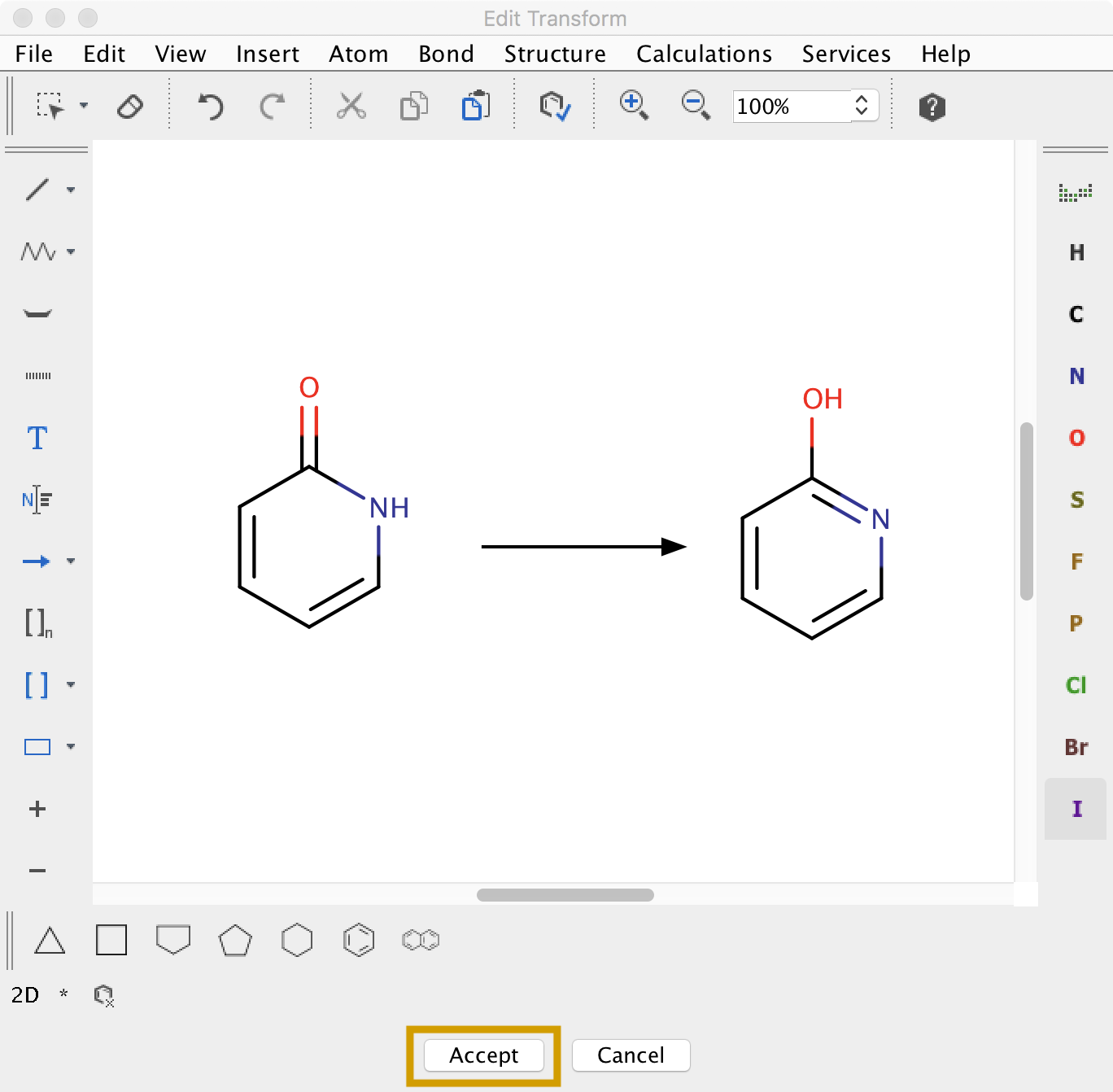 Do not forget mapping: by default, Standardizer assumes that changing atoms are mapped (Chemaxon mapping style).Double-click to edit structure: You can edit here the transformation and when you have finished drawing the transform, expand the drawing window and click the Accept button at bottom to return to the Standardizer window.