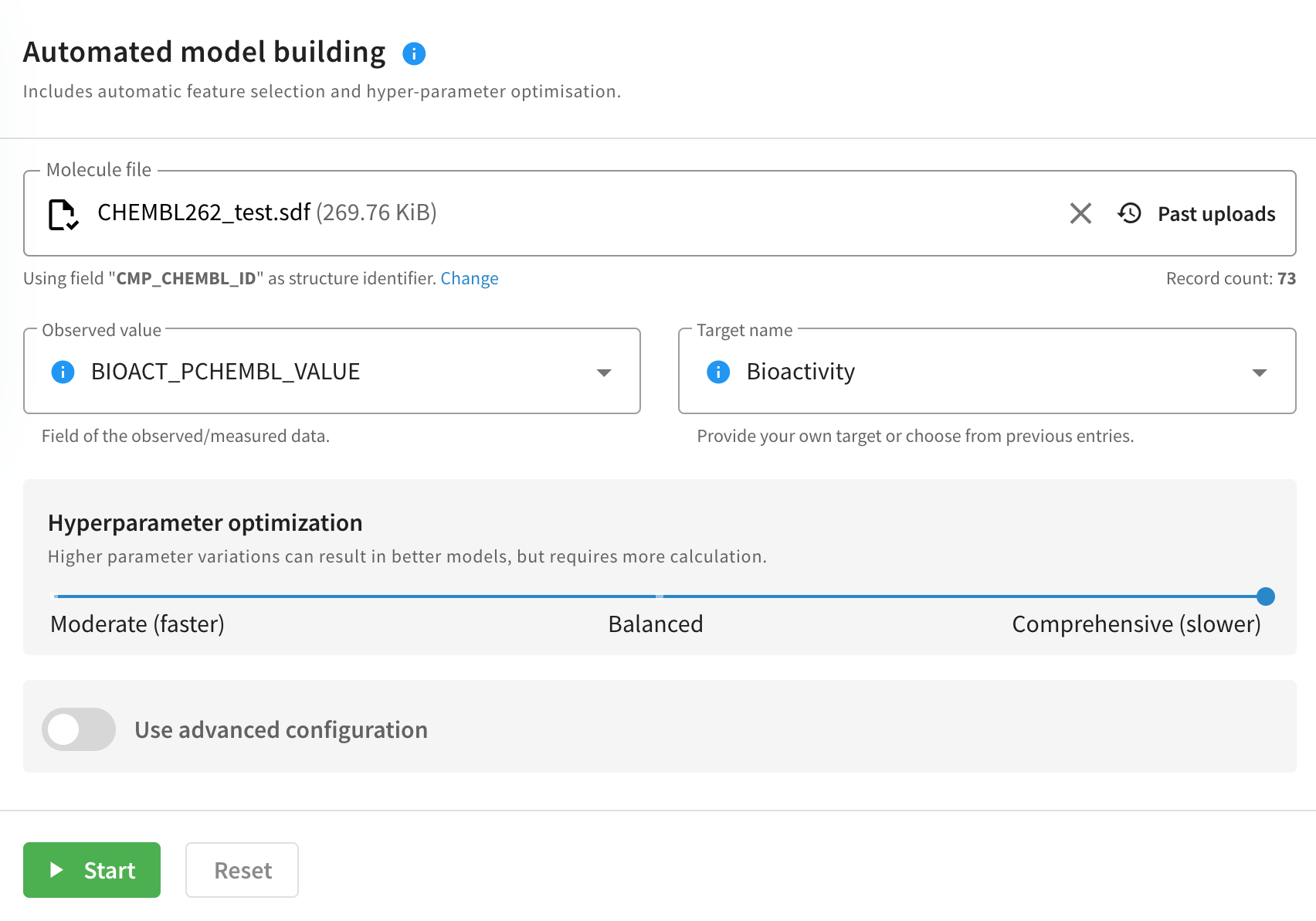 Upload an input file. The supported file format is .sdf, with labeled data stored in a mandatory sdf field. Also, set the Observed value and Target name fields.