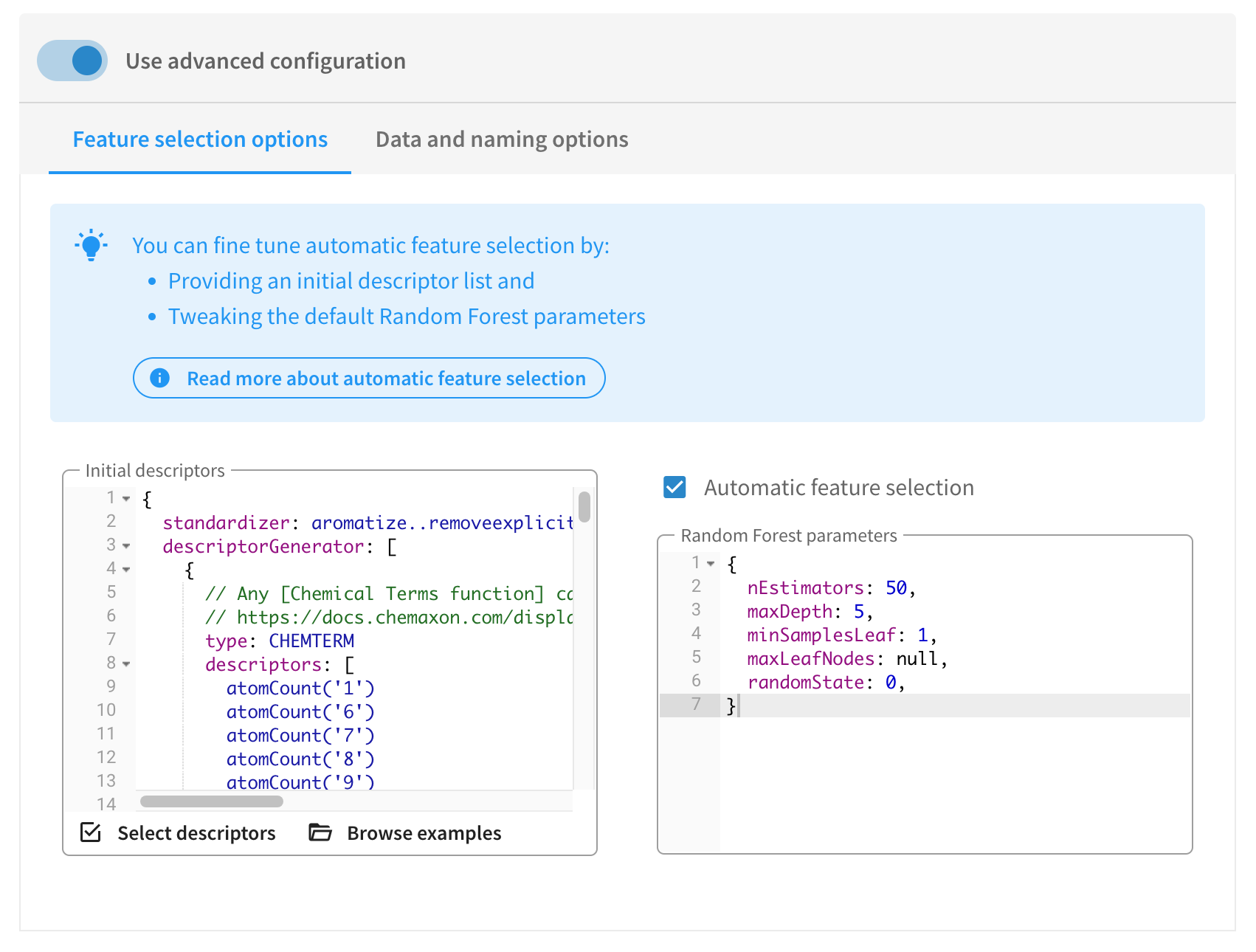 - Manual feature selection allows you to select the descriptors from a descriptor configuration file.
