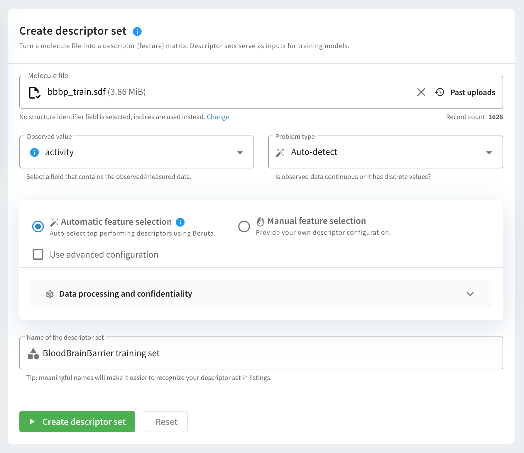 - Automatic feature selection uses the Boruta algorithm to choose the best performing descriptors.