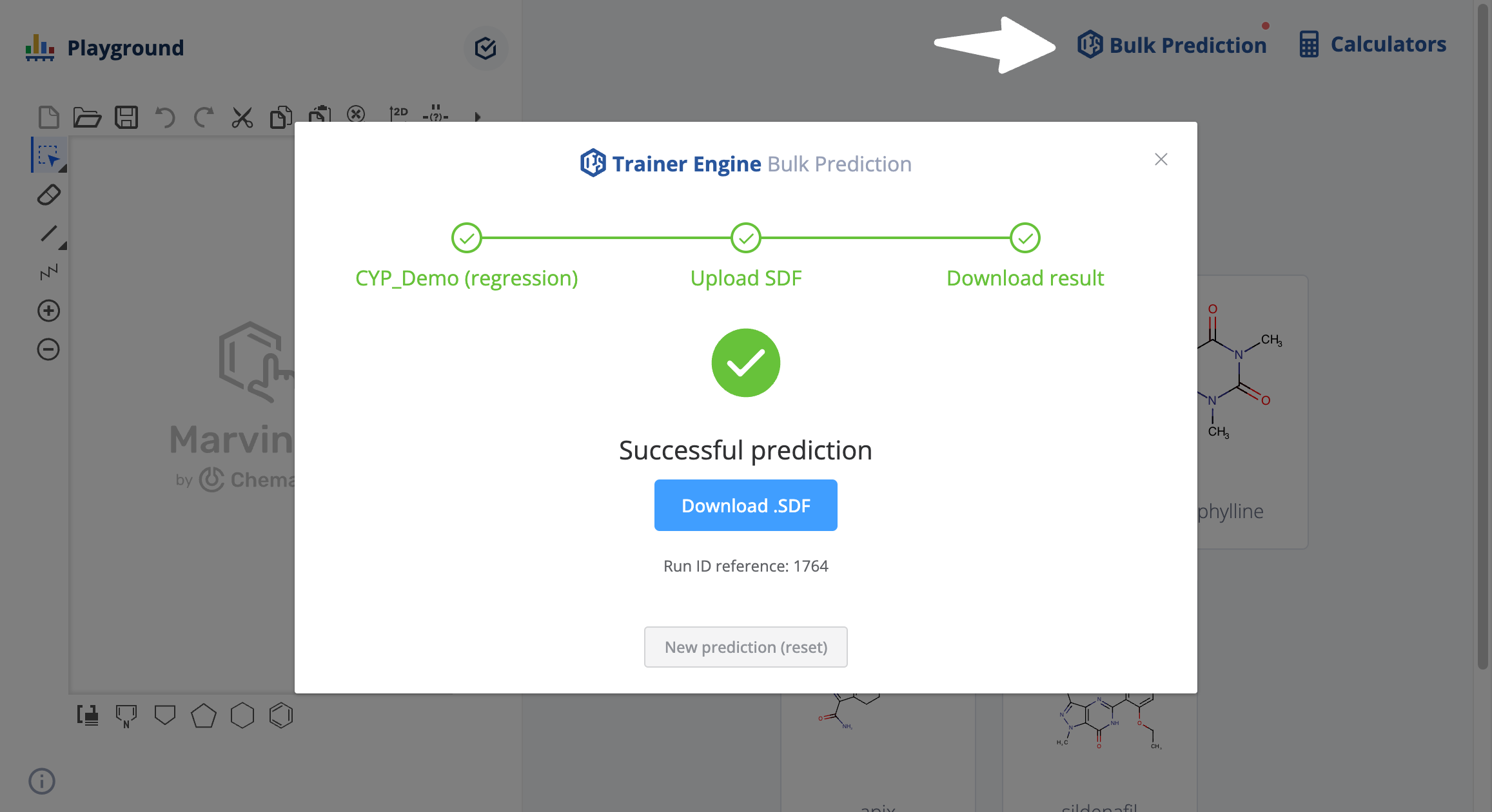 The Bulk Prediction icon opens a dialogue to select a Trainer Engine model and upload an sdf file. The results are available for download after prediction.