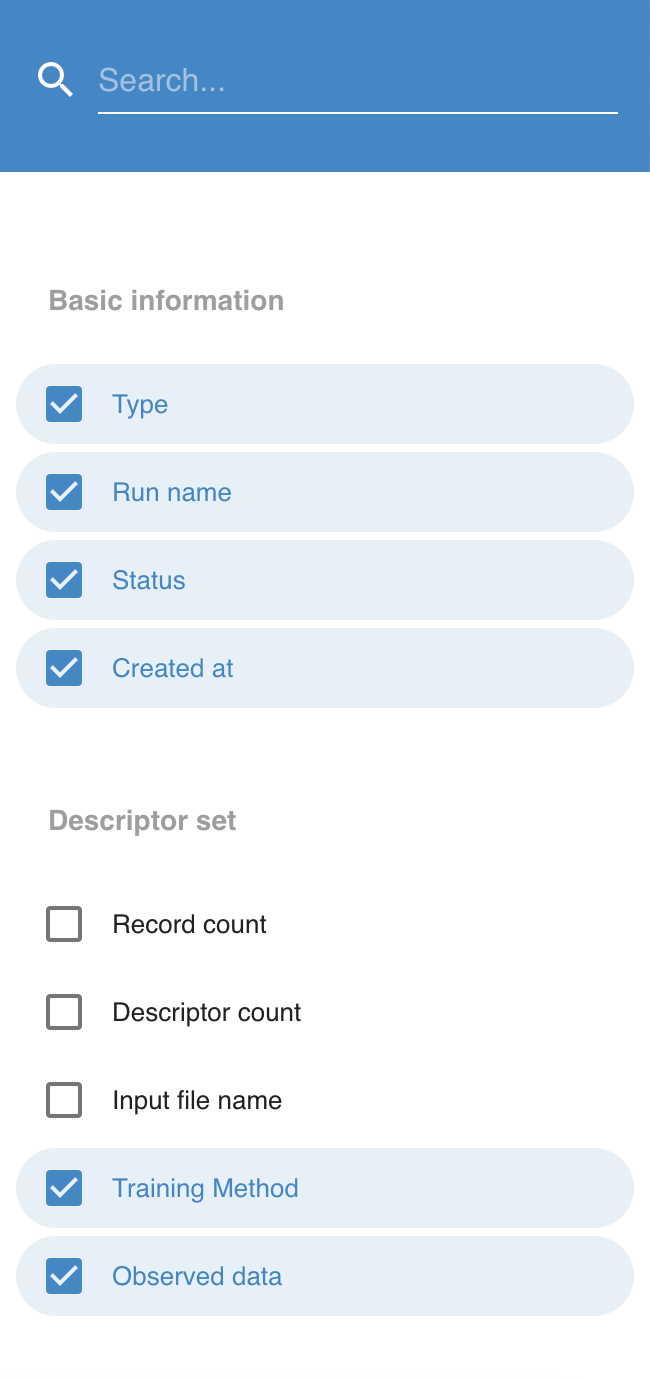 The Columns menu lists all available parameters of a run that can be selected to appear in the table. A simple text based search on the top of the menu can be used to narrow down the available parameters.