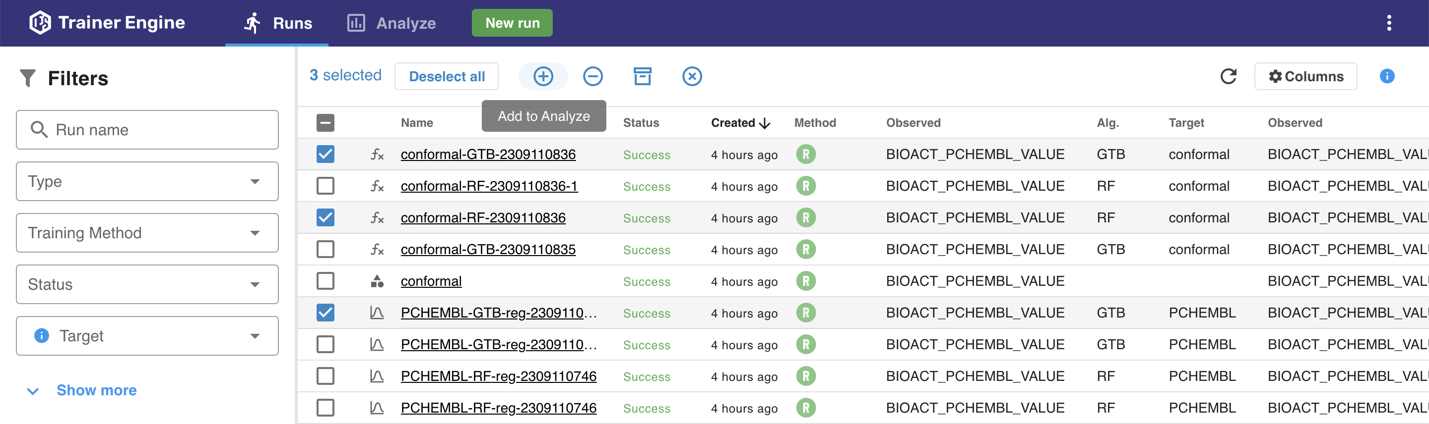 The Analyze page allows to compare selected runs and to analyse them in detail. It is a flexible and configurable view that supports visualization, comparison and assessment of model details and accuracy measures.